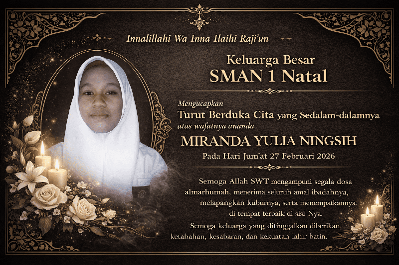 Keluarga Besar SMA Negeri 1 Natal Mengucapkan Turut berbelasungkawa atas meninggalnya Ananda "MIRANDA YULIA NINGSIH" Siswi Kelas X, Pada Hari Jum'at Tanggal 27 Februari 2026 Pukul 17.00 WIB dengan Alamat Rumah Duka Perumahan PT RMM, dan akan diberangkatkan Ke Medan Untuk dikebumikan di TPU di Medan.